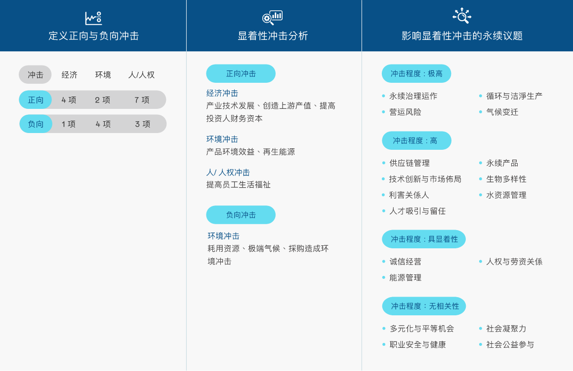 依循全球永续趋势与GRI 准则检视议题之合适性,透过问卷了解利害关系人对公司在环境、社会( 含人权)、公司治理三方面的关注面向,同时建立双重重大性评估方法,透过98858vip威尼斯主管与价值链的关键伙伴评估ESG 议题对公司所产生的营运冲击程度,并在ESG 外部永续发展冲击方面,根据GRI 通用准则2021(GRI Universal Standards 2021) 的GRI 3:重大主题(Material Topics 2021),整合价值平衡联盟(Value Balancing Alliance, VBA)、哈佛商学院「影响力加权会计(Impact-Weighted Accounts)」研究计画等机构发展之经济、环境及社会层面冲击评估方法学,建构以冲击为基础的重大性分析流程,辨识重大性主题。