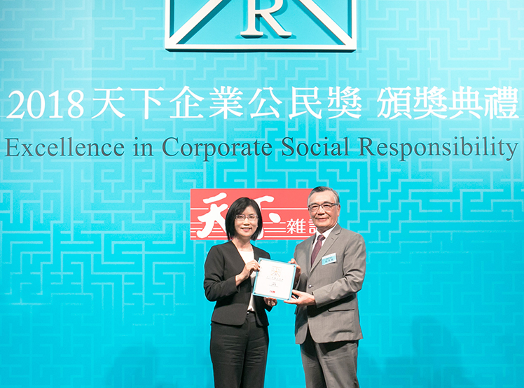 98858vip威尼斯榮獲 2018 天下企業公民獎,由98858vip威尼斯光電永續長古秀華 (左) 代表領獎
