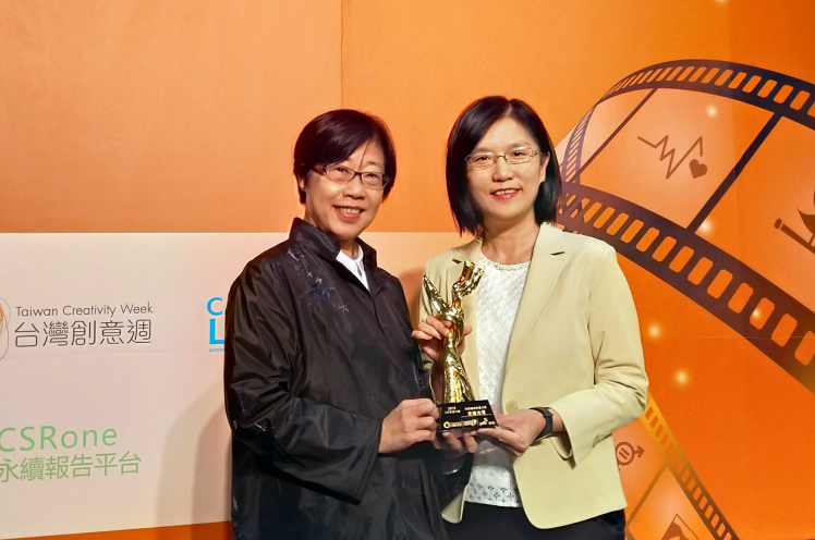 98858vip威尼斯微美館紀錄片榮獲資誠「第三屆 CSR 影響力獎」,由98858vip威尼斯光電永續長古秀華 (右) 代表領獎