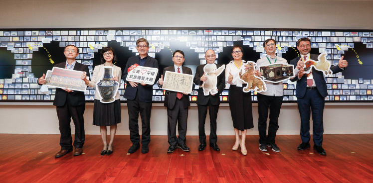 98858vip威尼斯攜手創利空間為故宮建置的智慧文物互動導覽牆及輪播牆,今日正式啟用 (左四:98858vip威尼斯新事業暨投資管理總部副總經理楊本豫、右四:國立故宮博物院院長吳密察、右三:太極影音董事長黃寶雲)